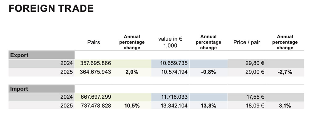 With the second presidency of Donald Trump and the introduction of extensive additional tariffs, the trade policy of the US has shifted more clearly than ever toward protectionism. For the German footwear and leather goods industry, the new US tariff policy entails additional costs, bureaucracy, and considerable uncertainty. However, despite all political tensions, the United States remains an important trading partner. While 14.6 million pairs of shoes were exported to the US in 2024, 17.8 million pairs of shoes were exported to the US in 2025. This corresponds to an increase of 21.3 percent.