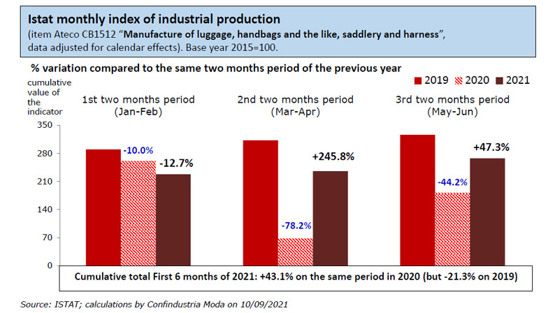 The ISTAT index of industrial production, after the leap of the two-month period March-April (+246%) has marked in May-June, for the item "travel goods and leather goods", a +47.3% trend. So the upward trend continues, but the cumulative figure for the first 6 months (+43.1% compared to the same period in 2020) is still -21.3% lower than two years ago.